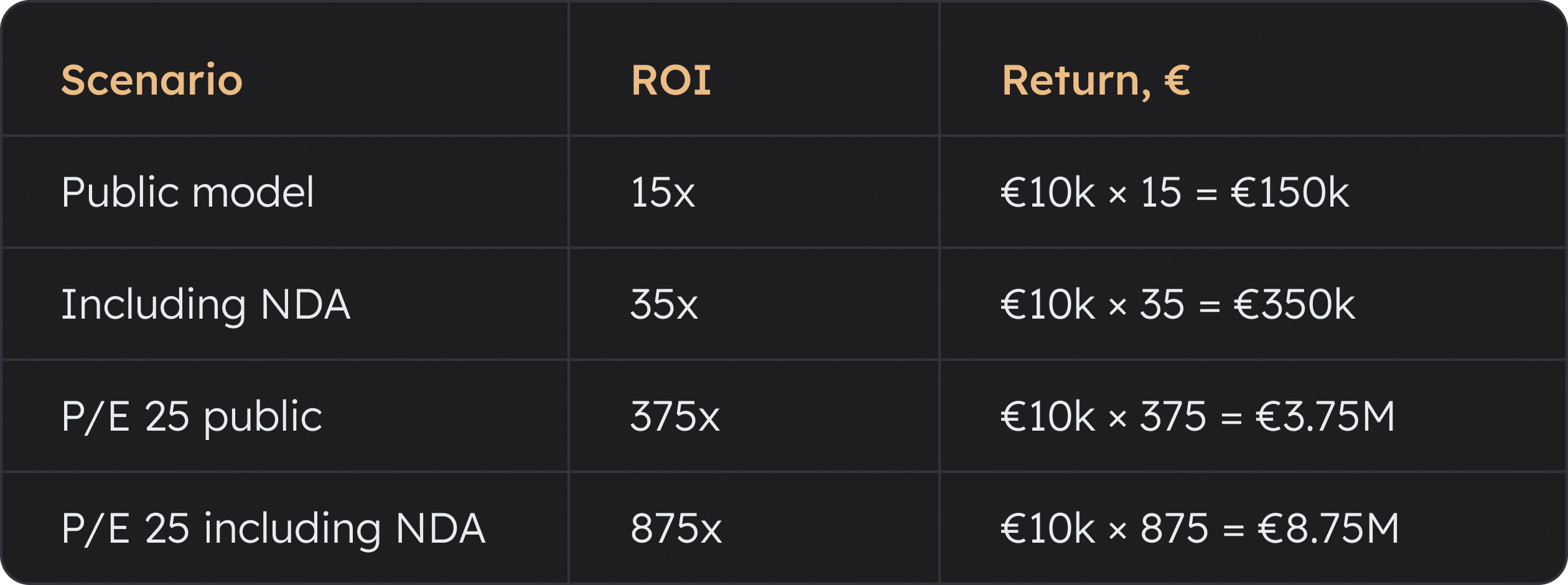 The architecture targets unicorn scale. The math is done: €5M unlocks €3.5B upside. 35x baseline. 875x modeled. We stay conservative, but we build for scale.