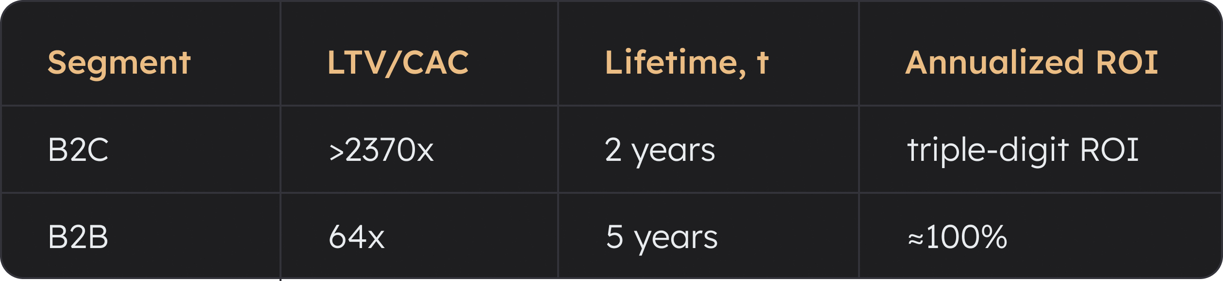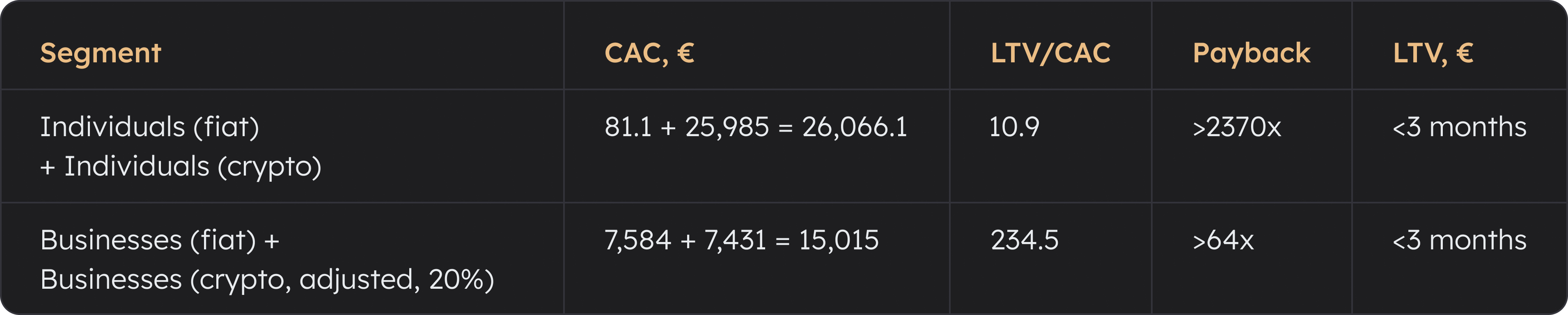 - Because verified LTV/CAC models show €5M scaling to €3.5B, with business LTV of €7,584 (fiat) + €7,431 (crypto) at CAC €234.50. Full model is in the Data Room.